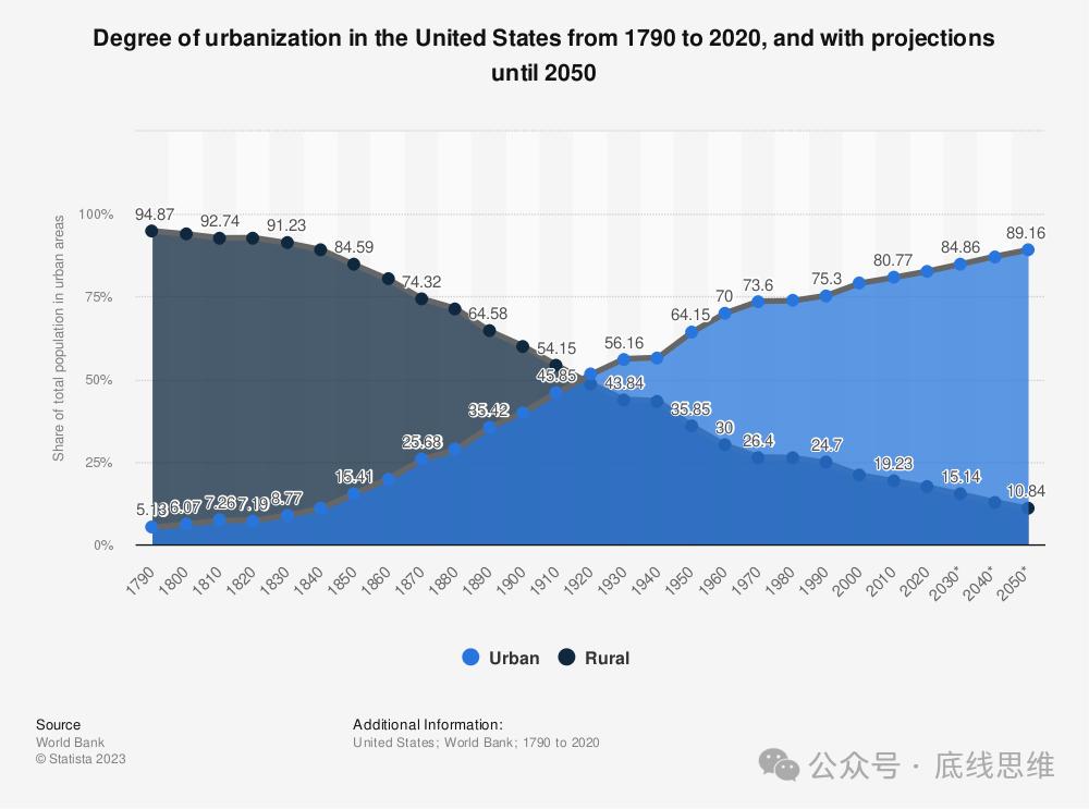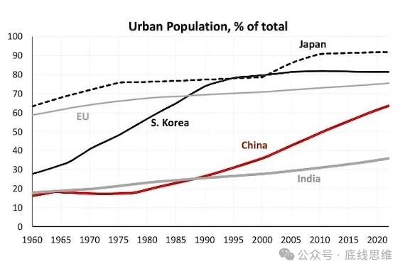 作为比照,美国的城市人口占比(也称为城市化程度)约80%,加拿大约82%,澳大利亚约86.4%,德国约77%,日本约92%,韩国约82%,俄罗斯约75%。