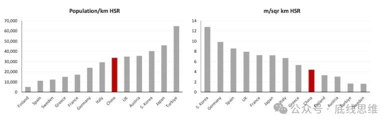 各国每公里高铁对应的人口(左)和每平方公里国土对应的高铁长度(右)