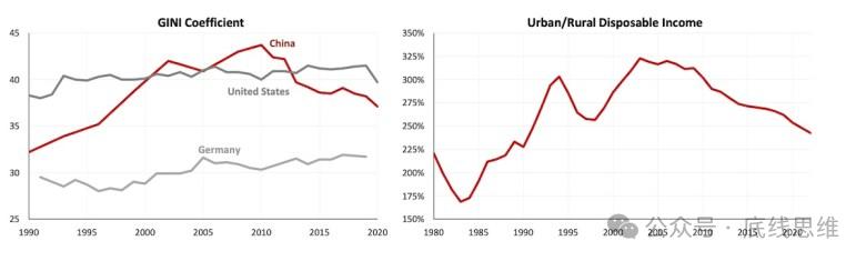 中国基尼系数的走势(左)与城乡收入差别的走势是一致的,说明缩小城乡差别对分配公平也是至关重要的