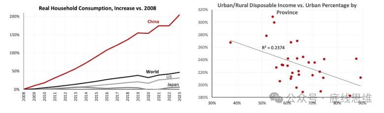 左图:与2008年相比的居民消费:中国(红线),世界(黑线),美国(灰线)、日本