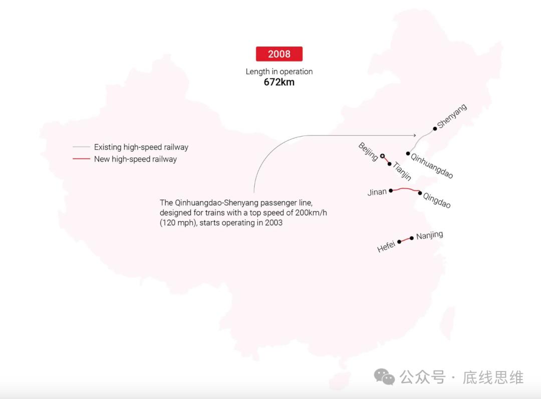 2008年可算是中国高铁元年,沈阳到秦皇岛段已经建成,北京-天津线也建成了。但就“高铁纪元”来说,这些已经是“史前建设”了,新建成的是青岛-济南和南京-合肥线。
