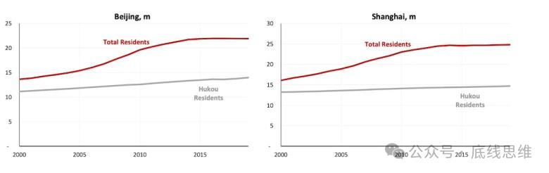 北京(左)、上海(右)的人口增长已经趋平,灰线为户籍人口