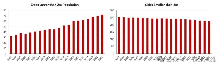 200万人以上的城市数量(左)在稳定增长,200万人以下的则在缓慢降低