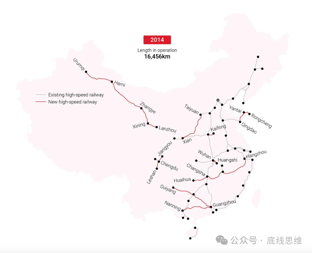 2014年又是大年,乌鲁木齐-兰州线建成,太原-西安、杭州-怀化、江油-乐山、贵阳-广州、南宁-广州线建成。高铁网已经很有样子了,四纵四横差不多成型了。