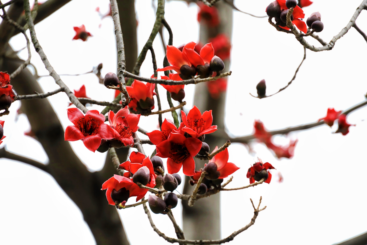 一朵花,红遍一座城。在广州市黄埔区市民广场靠近开创大道路段,木棉花近日进入盛花时期。木棉花,又名英雄花。火红木棉竞相盛开,满树鲜红而硕大的花朵像一簇簇“火团”,向上而热烈,彰显春天磅礴的生机,成为城市街道独特的风景,吸引了不少市民游客驻足观赏。