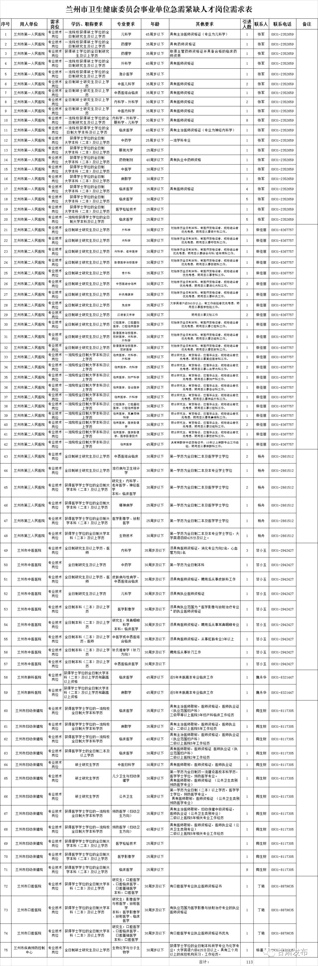 1、2019年兰州市卫生健康委员会系统招聘113人