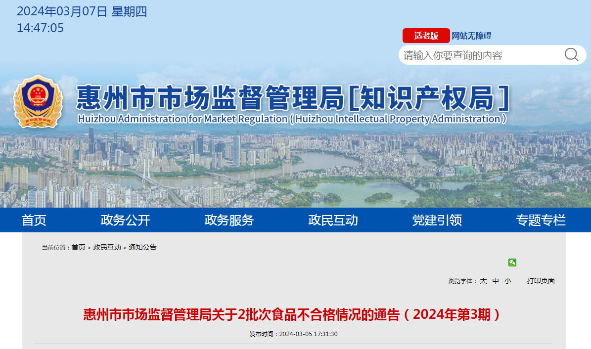 惠州市市场监督管理局关于2批次食品不合格情况的通告(2024年第3期)