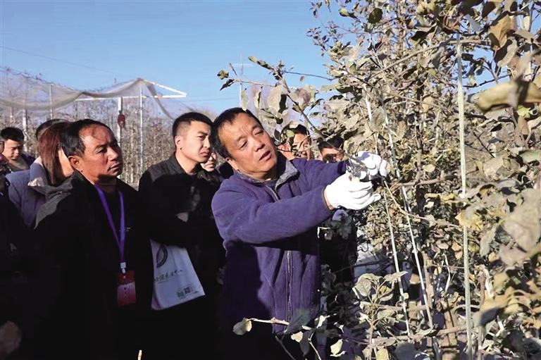 3月4日,在洛川县黄章便民服务中心黄章村的果园里,农技专家王晓东(右一)指导果农修剪果树。 本报通讯员 李进摄