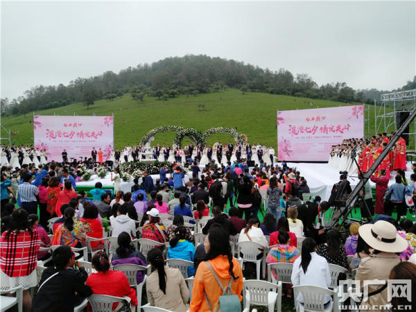 央广网西安8月17日消息(记者温超)中国·宝鸡“西凤酒·浪漫七夕·情定关山”集体婚礼今天(17日)在陕西省宝鸡市陇县关山草原旅游风景区举行,88对新人喜结连理,以集体婚礼这种浪漫、新颖、简朴、隆重的形式,倡导节俭温馨、婚事新办、向上向善的文明新风。