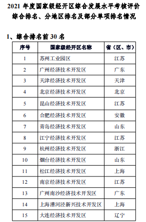 #放榜 217家国家级经开区考评结果出炉 苏州工业园区居首近日,商务部公布2022年国家级经济技术开发区综合发展水平考核评价结果。江苏、浙江、上海等15省市30个国家级经开区综合考核评价居前。此次考核评价首次实施新修订的《国家级经济技术开发区综合发展水平考核评价办法(2021年版)》,对217家国家级经开区2021年度综合发展水平情况进行考核评价。