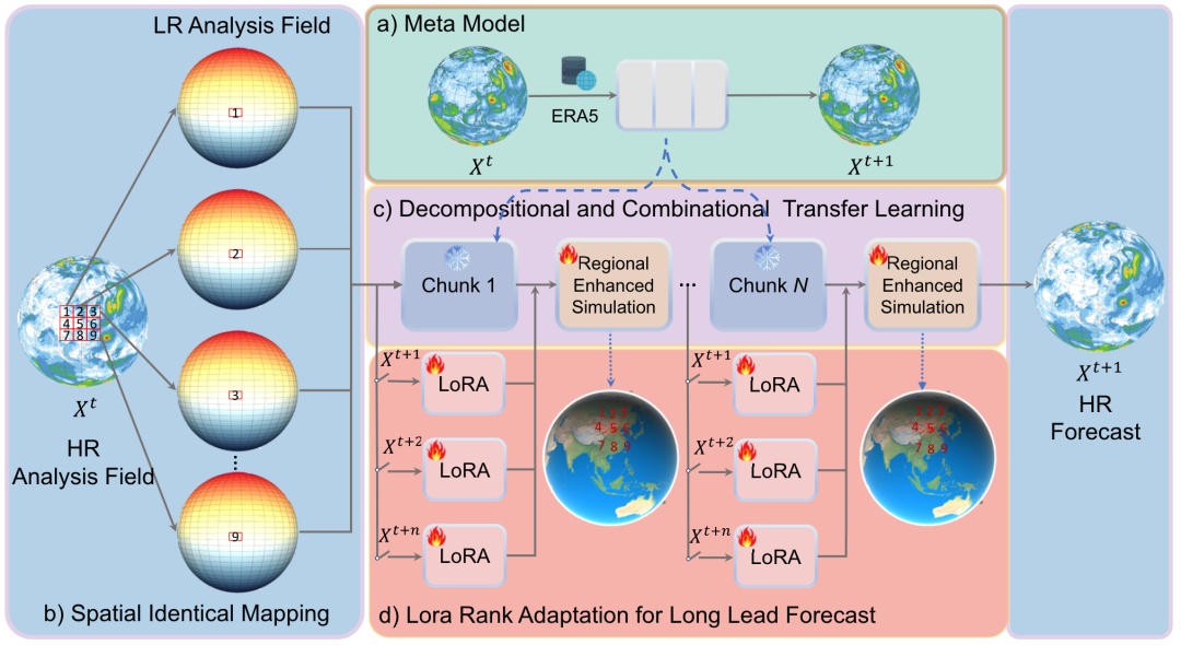 它采用了一种新颖的方法,即从一个预训练的低分辨率模型中继承先验知识。这个策略为高分辨率的天气预测模型提供了宝贵的启示,实现了先进模型之间的信息传递,为高分辨率预测提供了新的可能。