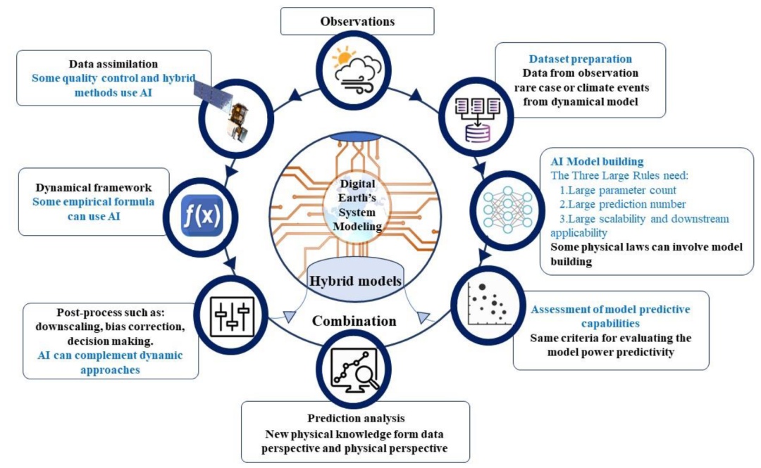 图|大型 AI 模型与动态模型的可能集成示意图,用来改善天气预报。