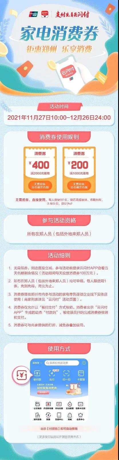 郑州人注意,11月27日上午10:00,郑州家电消费券就要和大家见面了!本次消费券发放总额3000万元,为期一个月。家电消费券无须抢券,到店消费直接立减,最高可减400元。