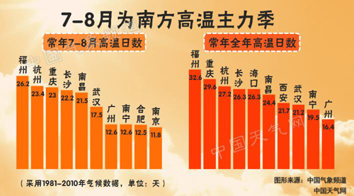 从常年的高温天数排行来看,前五名为福州、杭州、重庆、长沙和南昌,尤其福州、重庆、杭州、长沙即便在全年,排名依然稳居前五位,公众如果去这些地方旅游,一定要做好防暑准备。