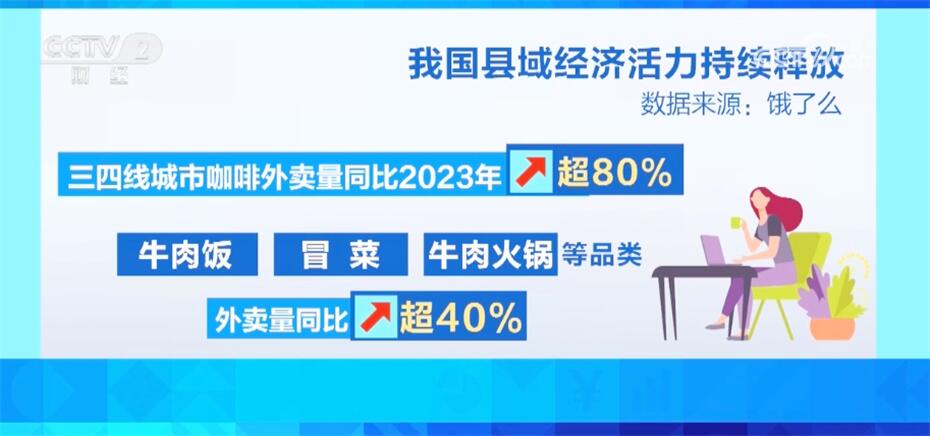 今年以来,三四线城市的餐饮消费活力持续释放。来自某生活服务平台的数据显示,今年开年后,三四线城市咖啡外卖量同比去年增长超过80%,牛肉饭、冒菜、牛肉火锅等品类外卖量同比增长超过40%。春节假期期间,三四线城市螺蛳粉、甜品、沙拉轻食、咖啡和奶茶果汁等热门餐食的外卖量更是同比增长超过1倍。