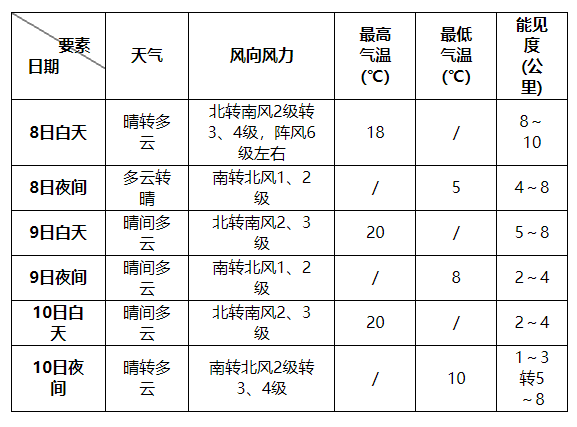 今晨,北京城区气温6~10℃,能见度3~10公里,风力不大。预计未来三天,北京城区天气以晴间多云为主,白天最高气温20℃,夜间最低气温5~10℃;8日白天有6级左右阵风。8日夜间至10日大气扩散条件总体较差,最低能见度1~3公里。具体预报见下表: