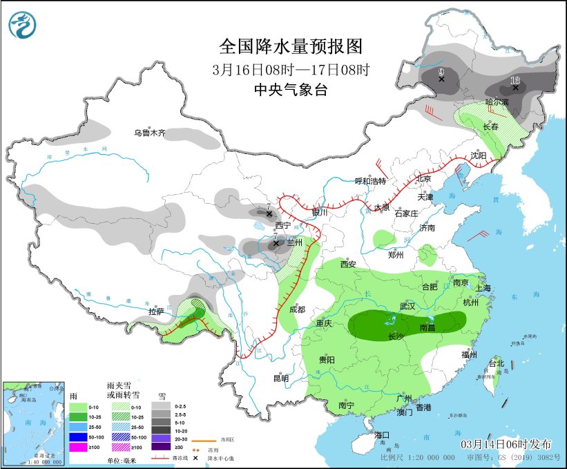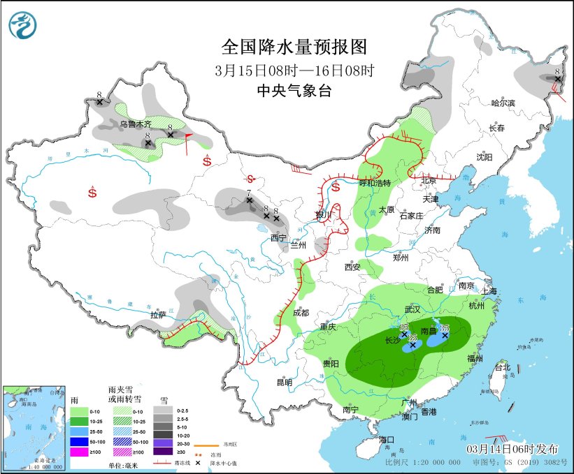 3月15日08时至16日08时,内蒙古中东部、黑龙江东北部、新疆沿天山地区、西藏南部和东部、青海北部、甘肃河西、宁夏南部等地部分地区有小到中雪或雨夹雪,其中,黑龙江东北部、新疆沿天山地区、青海北部和东部等地部分地区有大雪(5~8毫米)。陕西北部、山西北部、江汉大部、江南、华南大部等地部分地区有小到中雨,其中,湖南东部、江西中北部等地部分地区有大雨(25~35毫米)。新疆东部、内蒙古西北部和中部等地部分地区有4~6级风,其中,新疆东部部分地区有7~8级风,阵风10级以上。新疆东部和南部、内蒙古西部、青海西北部、甘肃中北部、宁夏等地的部分地区有扬沙或浮尘天气,新疆东部和南部、内蒙古西部、甘肃中北部局地有沙尘暴(见图3)。