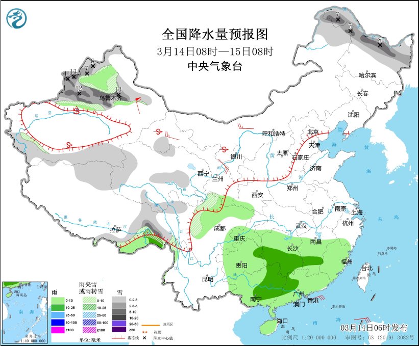 3月14日08时至15日08时,内蒙古东北部、黑龙江北部、新疆北部和沿天山地区、西藏东部、青海西部、川西高原北部等地部分地区有小到中雪或雨夹雪,其中,黑龙江北部、新疆沿天山地区和伊犁河谷、西藏东南部等地部分地区有大到暴雪(10~13毫米)。西南地区东部、江南大部、华南等地部分地区有小到中雨。新疆东部、内蒙古、甘肃河西和中部等地部分地区有4~6级风,其中,新疆东部部分地区有8~9级风,风口风力11~13级。新疆东部和南部、内蒙古西部、青海西北部、甘肃中北部、宁夏等地的部分地区有扬沙或浮尘天气,新疆东部和南部、内蒙古西部、甘肃中北部局地有沙尘暴(见图2)。