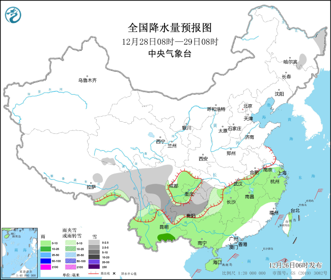 图1 全国降水量预报图(12月26日08时-27日08时)