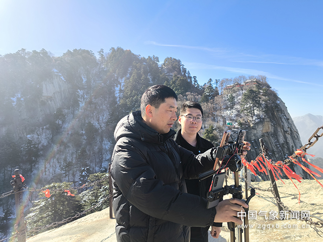 3月20日,陕西“华山气象君”慢直播上线,技术人员正在华山西峰调试设备。胡新国 摄影