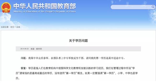 2014年8月,教育部在“我高中毕业后参军,在部队考上中专军校成为干部,请问我的第一学历是高中还是中专”的提问中回复:学历是指人们在教育机构中接受科学文化教育和技能训练的学习经历,我们在管理过程中所说“学历”通常指的是最高或最后的学历,没有使用“第一学历”概念。如果一定要强调“第一学历”,小学、中学也是学历。