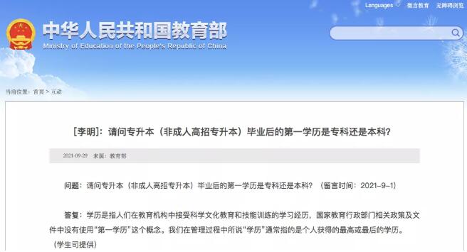 近日,教育部针对网友提问“专升本(非成人高招专升本)毕业后的第一学历是专科还是本科”进行答复。