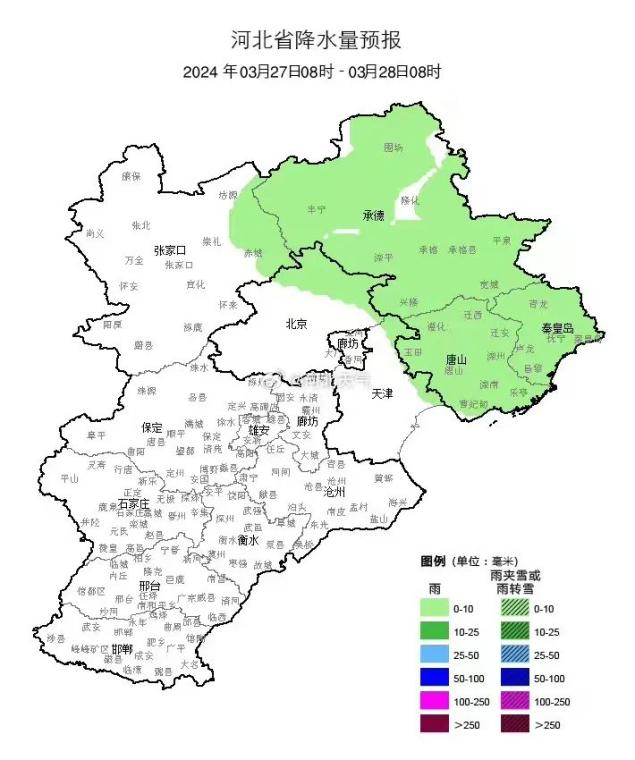 27日白天到夜间,张家口东部、承德、唐山、秦皇岛多云转阴有阵雨或雷阵雨,其中坝上地区有雨夹雪,其他地区多云转晴。北部和西部地区有北到西北风4到6级,阵风7到8级。