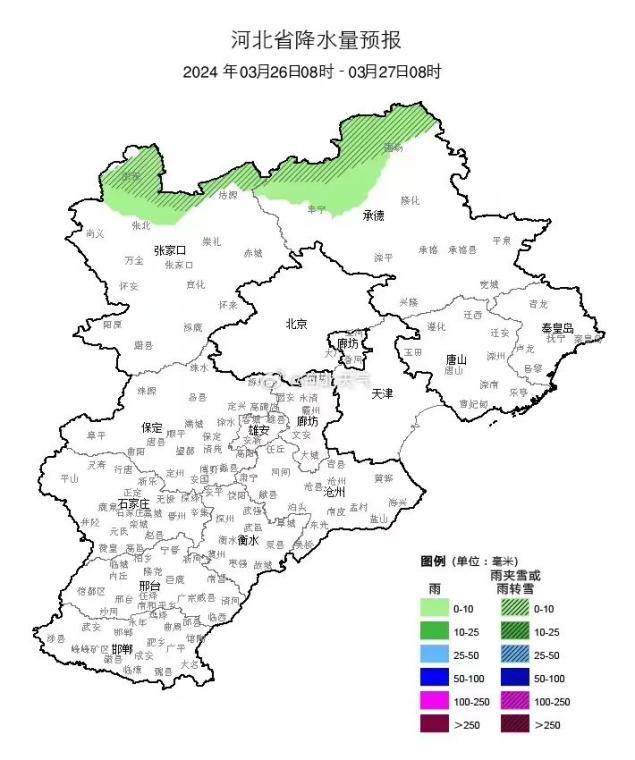 明天白天到夜间,张家口北部、承德北部多云转阴有小雨或雨夹雪,其他地区多云。