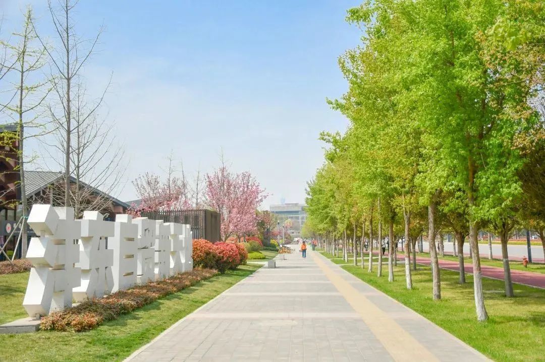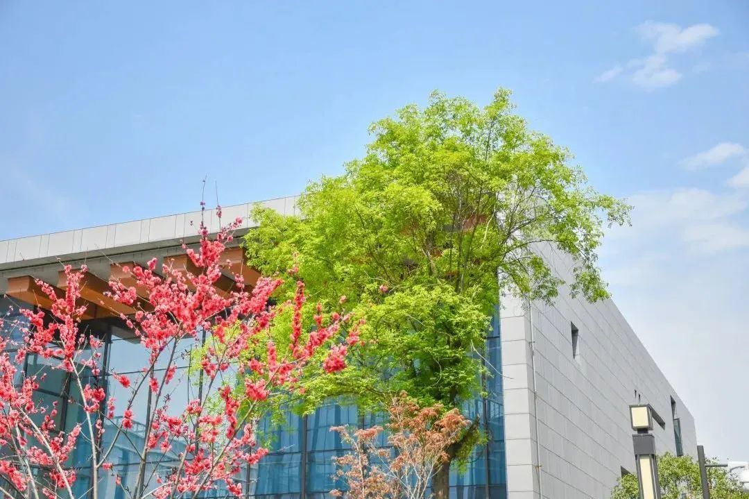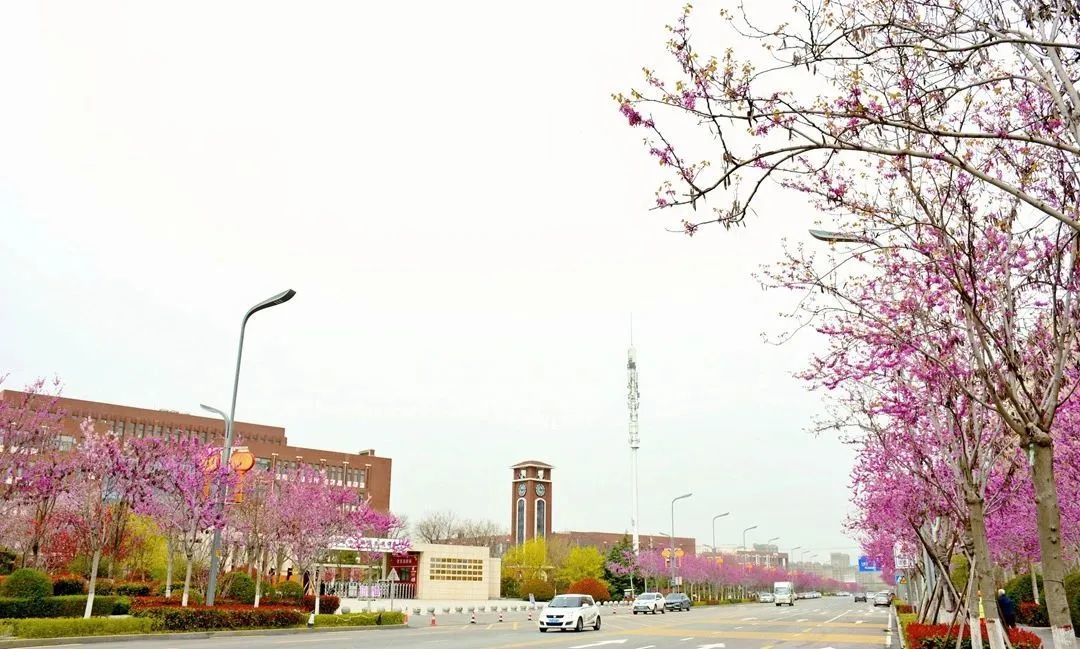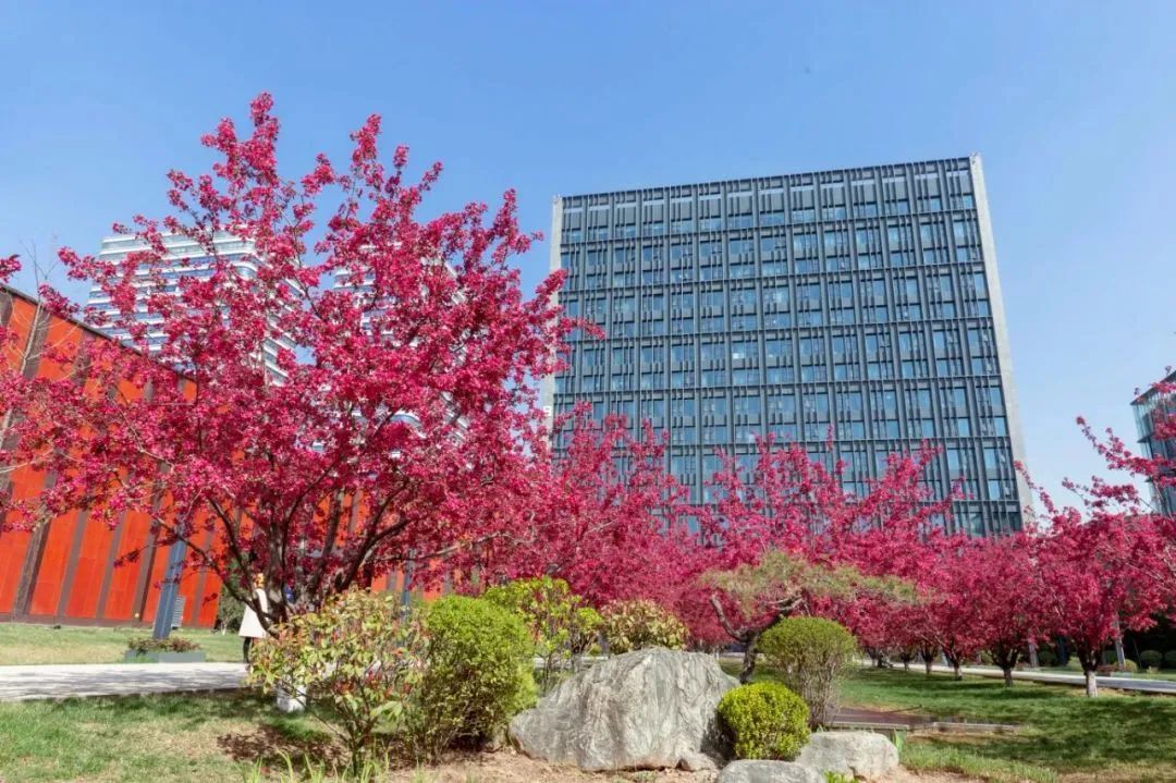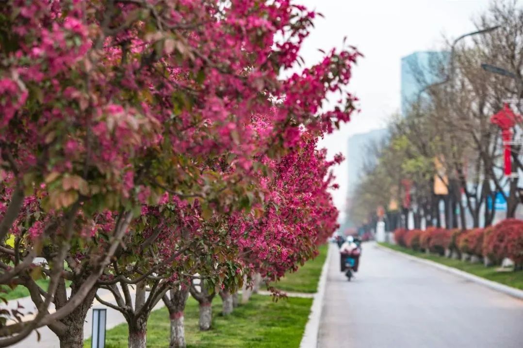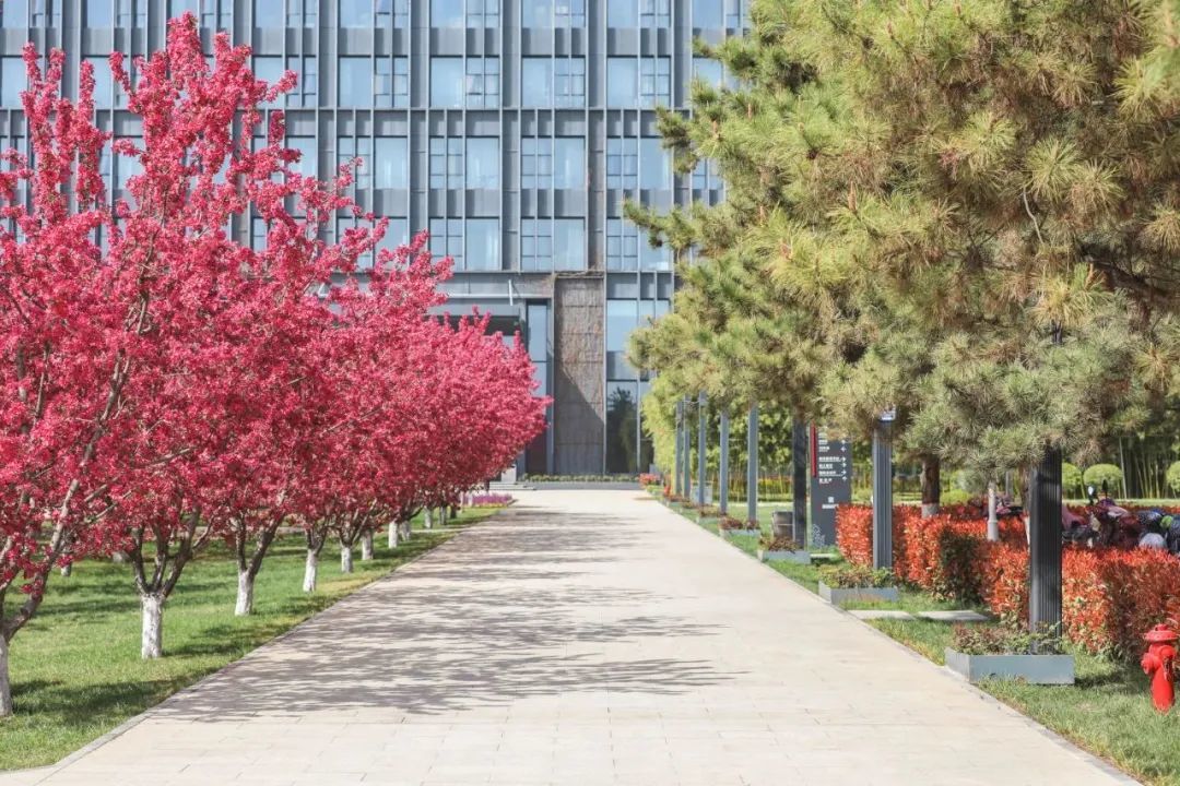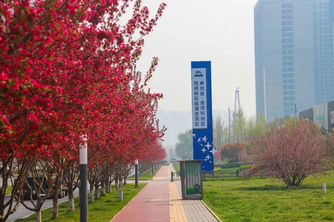 在沣西新城总部经济园能源金贸区上林路(南段)两侧,一树一树繁花,在科技蓝的映衬下,分外绚丽。