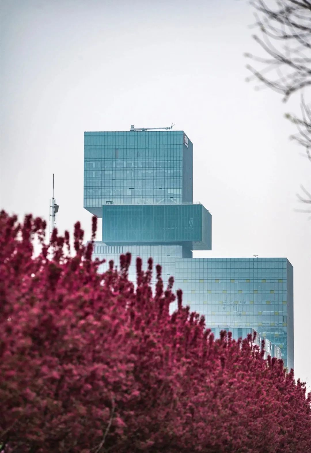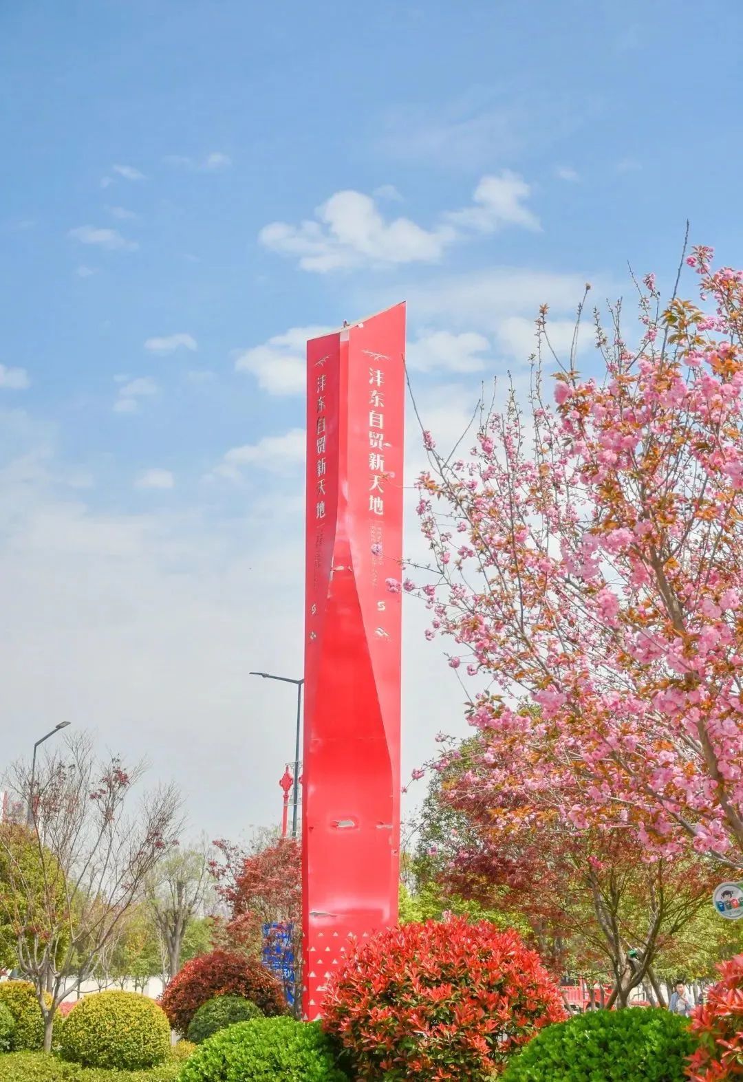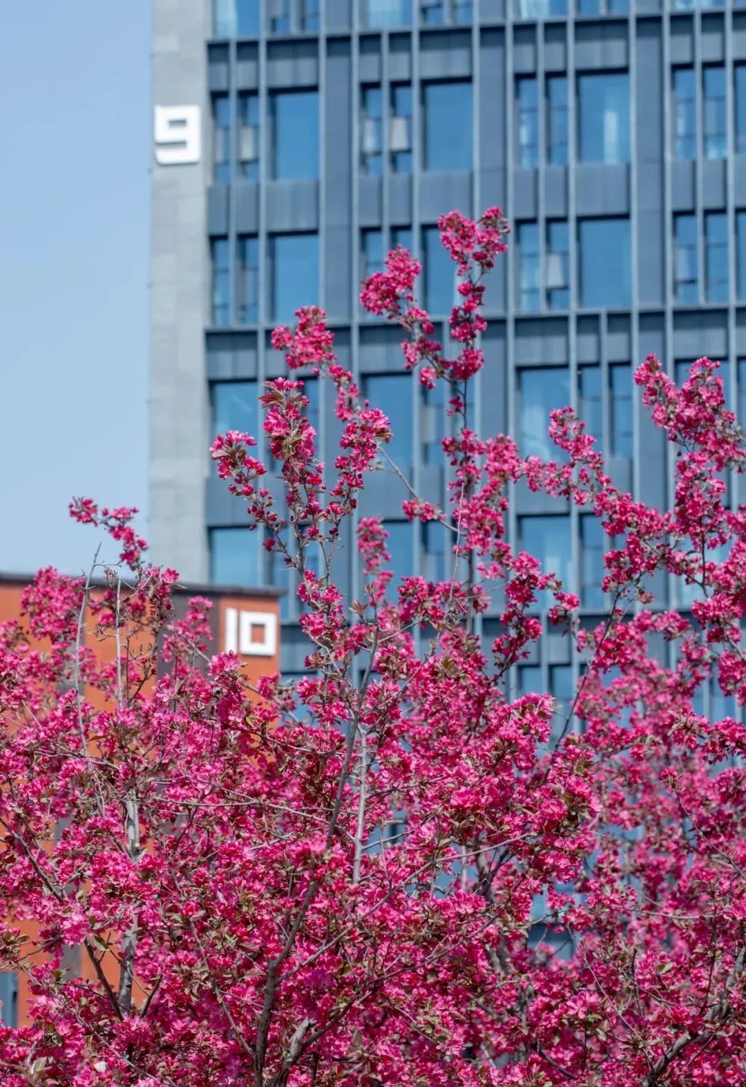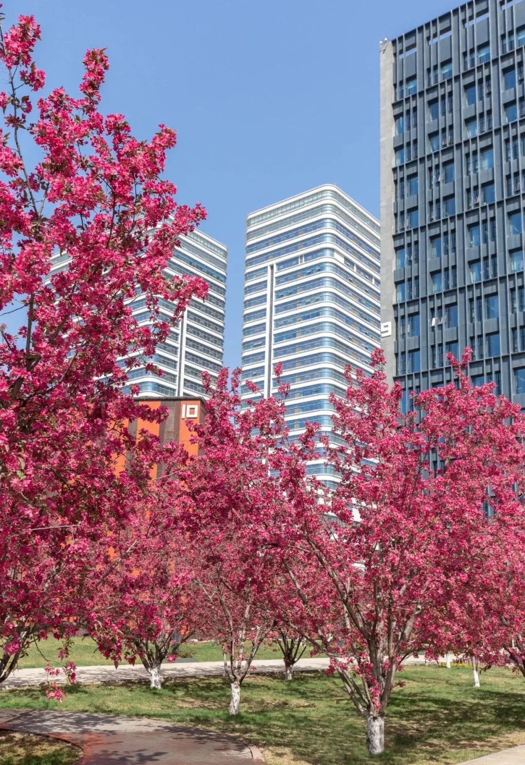在沣西新城总部经济园能源金贸区上林路(南段)两侧,一树一树繁花,在科技蓝的映衬下,分外绚丽。