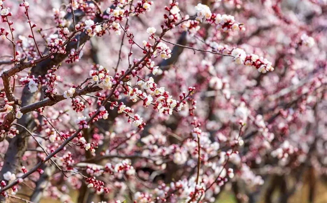 沣东梅园,上万株梅花即将迎来绽放期,成片梅花灿若云霞。
