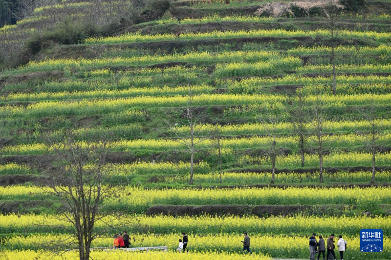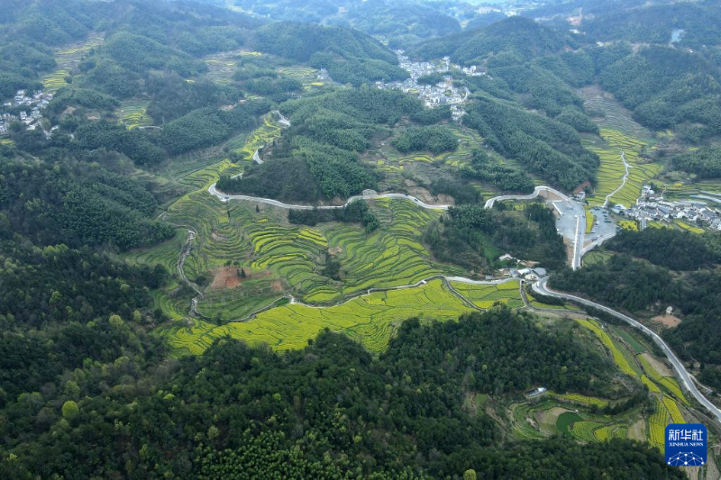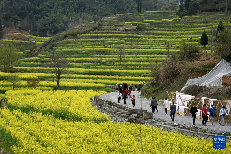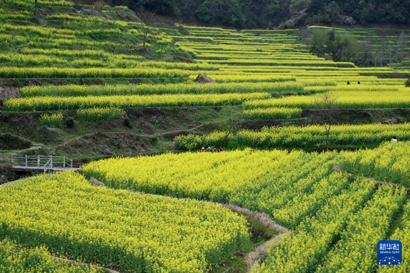 眼下,安徽省黄山市徽州区呈坎镇灵山村的梯田油菜迎来盛花期,层层叠叠的梯田上绽放的油菜花犹如金色波浪,吸引各地游客前来赏花踏青。