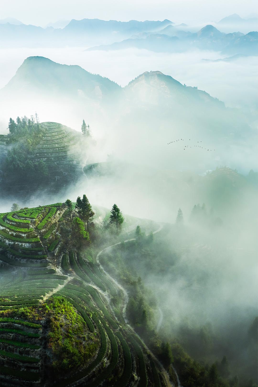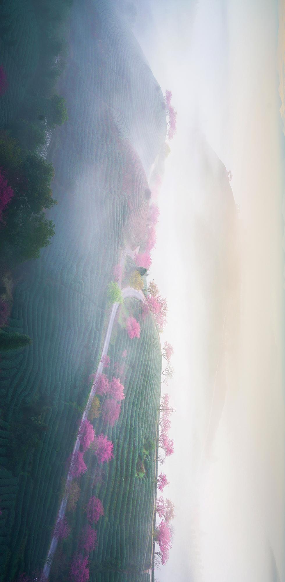 当山、水、云、雾、茶、花等自然元素集合在一幅画框之中,就构成了东方美学中或壮丽或婉约的图景,而中国最美的春天也就定格在这里了。