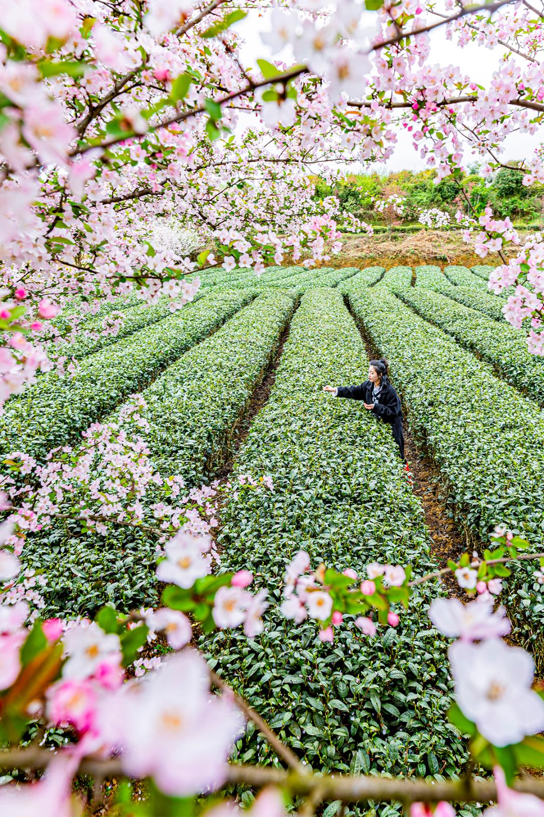 永福台品樱花茶园,粉红的樱花树点缀于茶田间。
