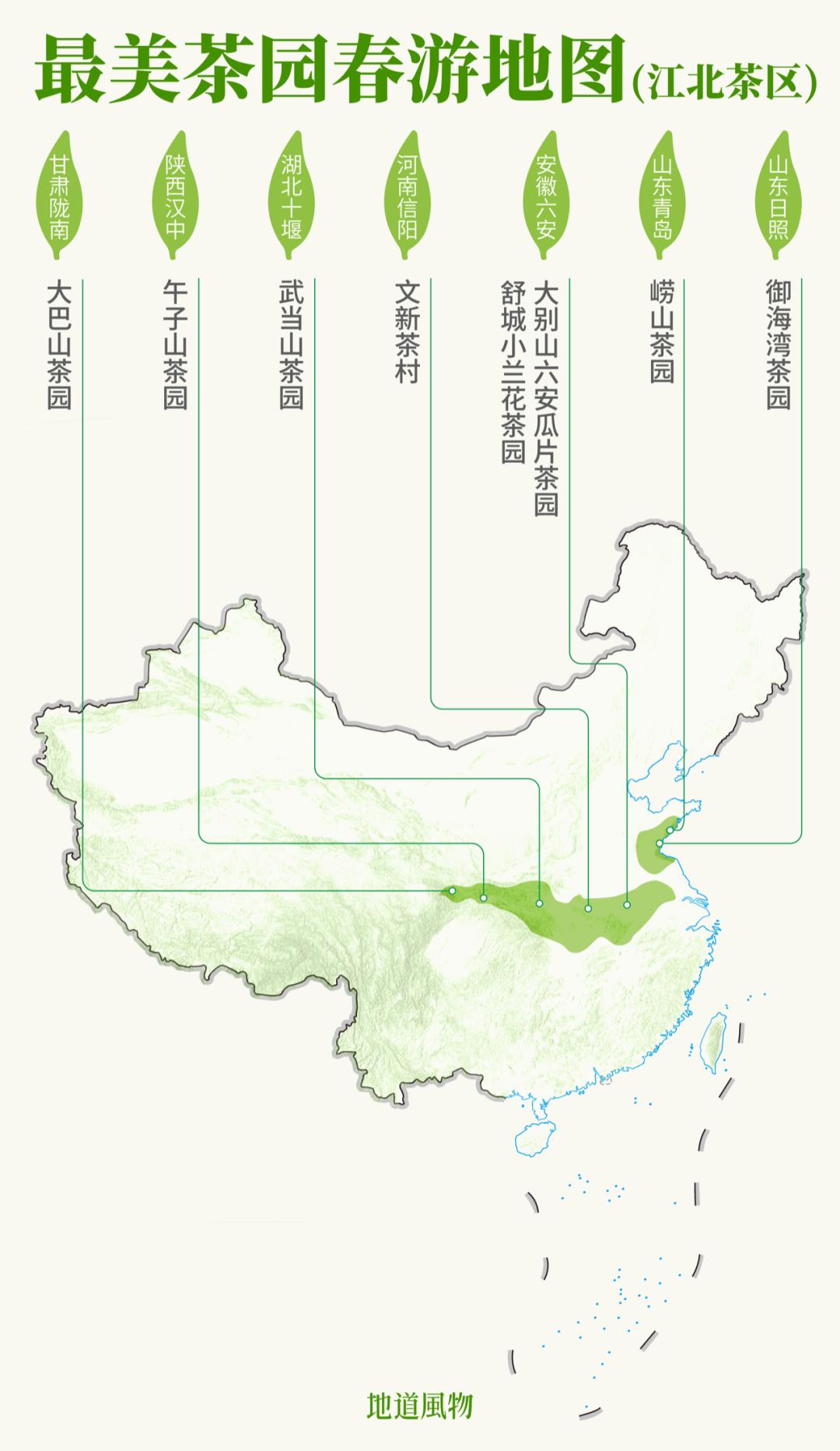 在长江以北,还有更多茶园刷新着大家对于茶的固有认知,陕西汉中,午子山茶园山势雄奇;甘肃陇南,大巴山茶园林海浩瀚;湖北十堰,武当山茶园除了山林色彩丰富,还多了一丝道教文化色彩......