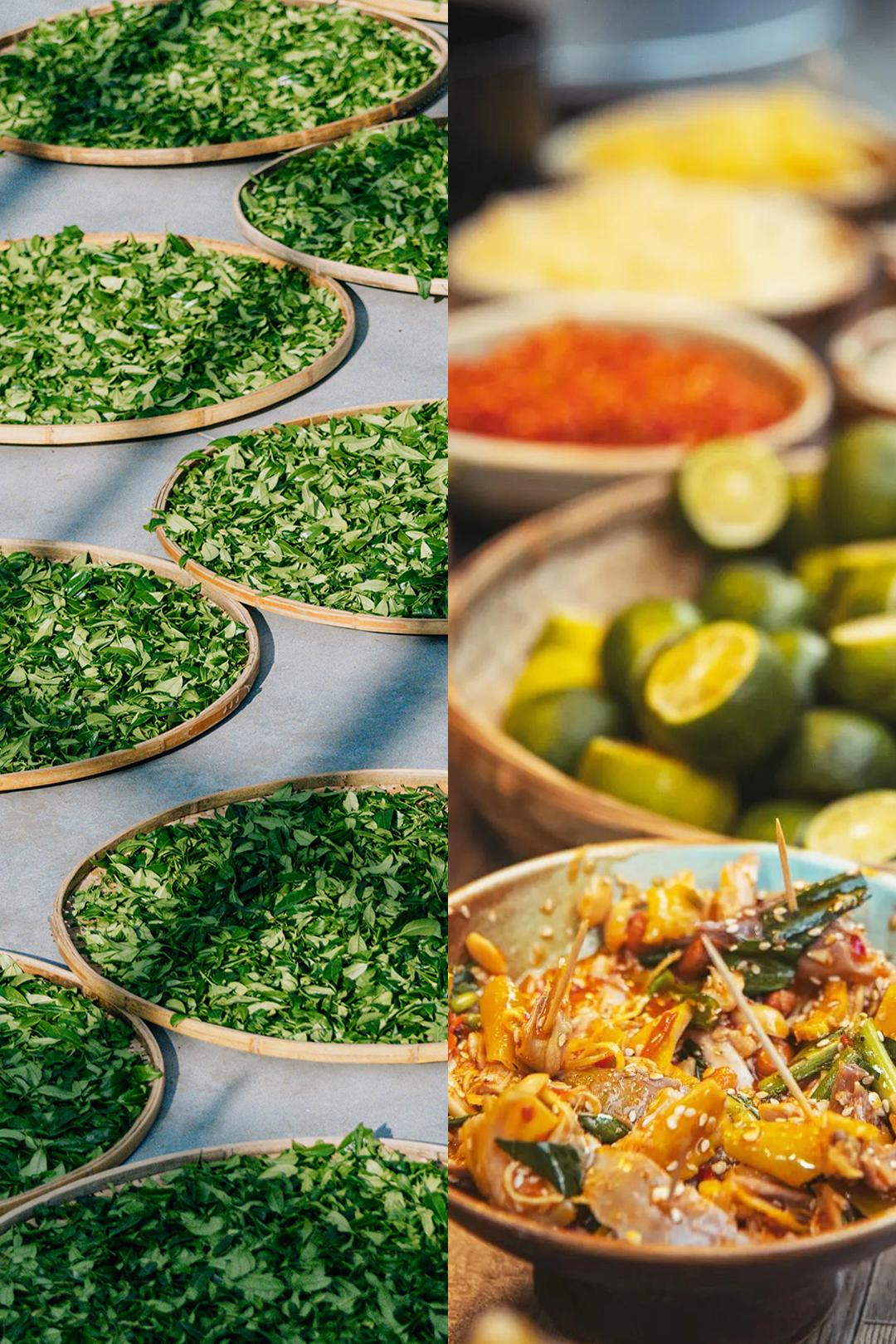在这片茶与森林混生之地,茶叶的山野气息也极其馥郁,景迈的普洱茶虽有微微涩感,但醇厚、甘甜且持久,小小的茶叶还在景迈山的全茶宴上展现着百般姿态,滑嫩清香的古树茶炒鸡蛋、爽辣刺激的凉拌茶叶尖,油炸煸香的干煸古树叶.....早春的滋味都被浓缩在舌尖。