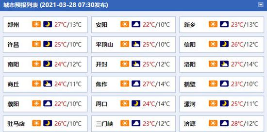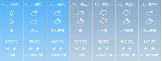 28日夜里到29日白天:晴转多云,13℃到18℃;