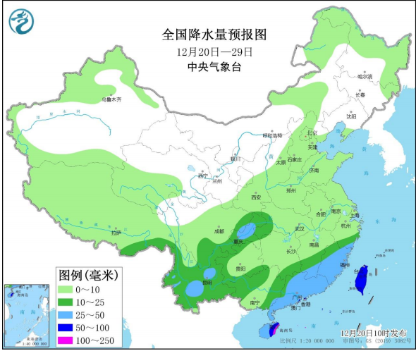 全国:未来10天(12月20-29日),东南部沿海大部有20~40毫米降水,局地有 50~100毫米;四川盆地东部和南部、云南大部等地有10~20毫米、局部25~30 毫米左右降水;上述地区降水量较常年同期偏多,我国其余大部地区降水偏少。未来10天, 内蒙古东部、东北地区大部等地平均气温较常年同期偏低2~4℃;新疆北部、内蒙古西部等地气温较常年同期偏高1~3℃,我国其余大部地区气温接近常年同期。冷空气影响时段在23-26 日。