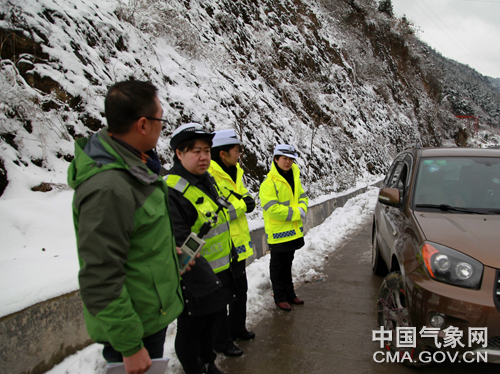 巴东县公安局车管所所长张阳(左二)正和气象局工作人员商讨应对冰雪措施。