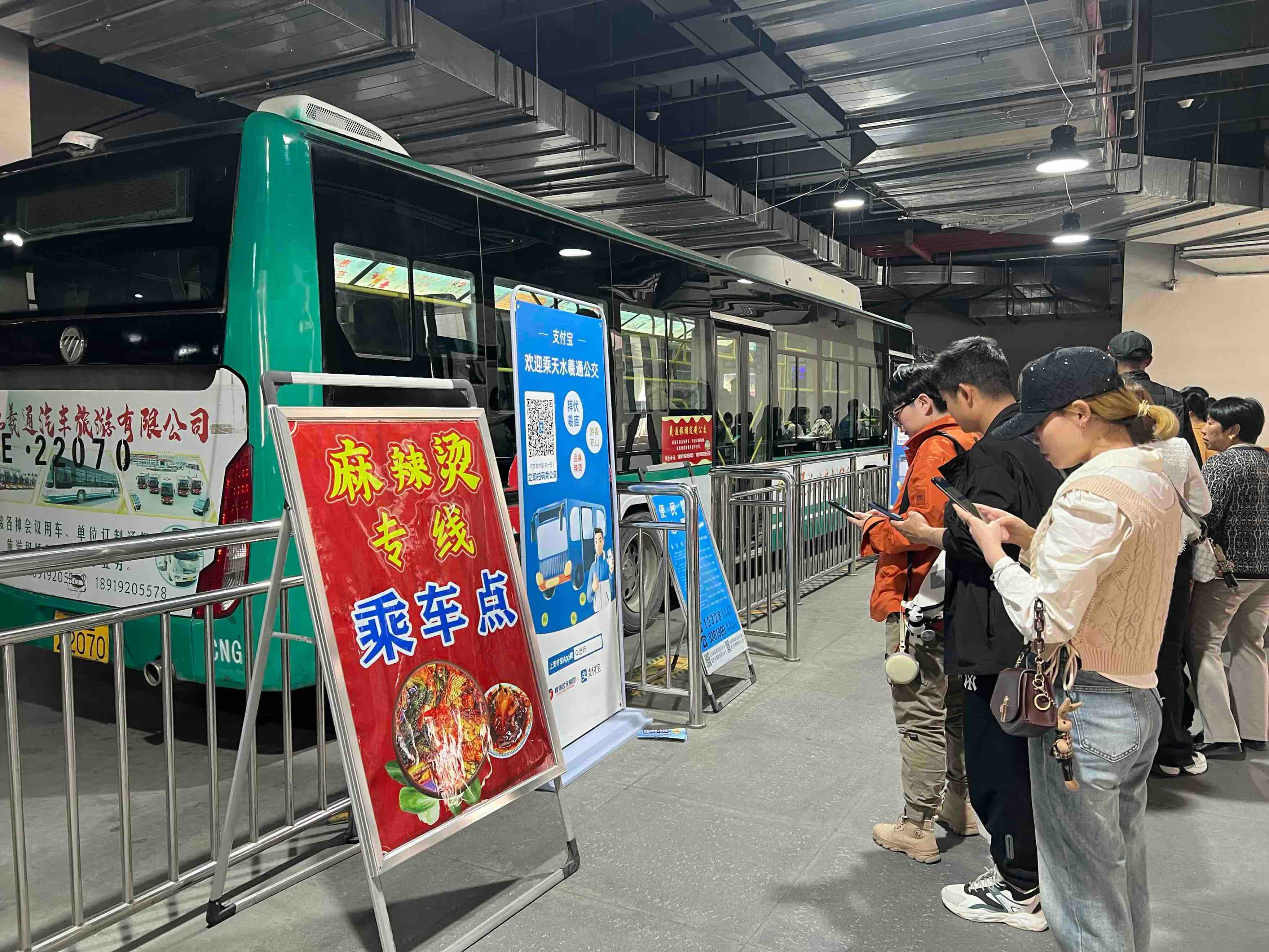 多名志愿者指引现场需要乘车的人,提前打开乘车码,等待乘车。每辆公交车共有座位40个,有些乘客还拉着行李箱。“现在上车,虽然没有座位,但是麻辣烫能少排半个小时的队。”司机吆喝大家上车。和早高峰的公共交通一样,等车满了就发车。这样的一趟公交车,乘车费为3元。