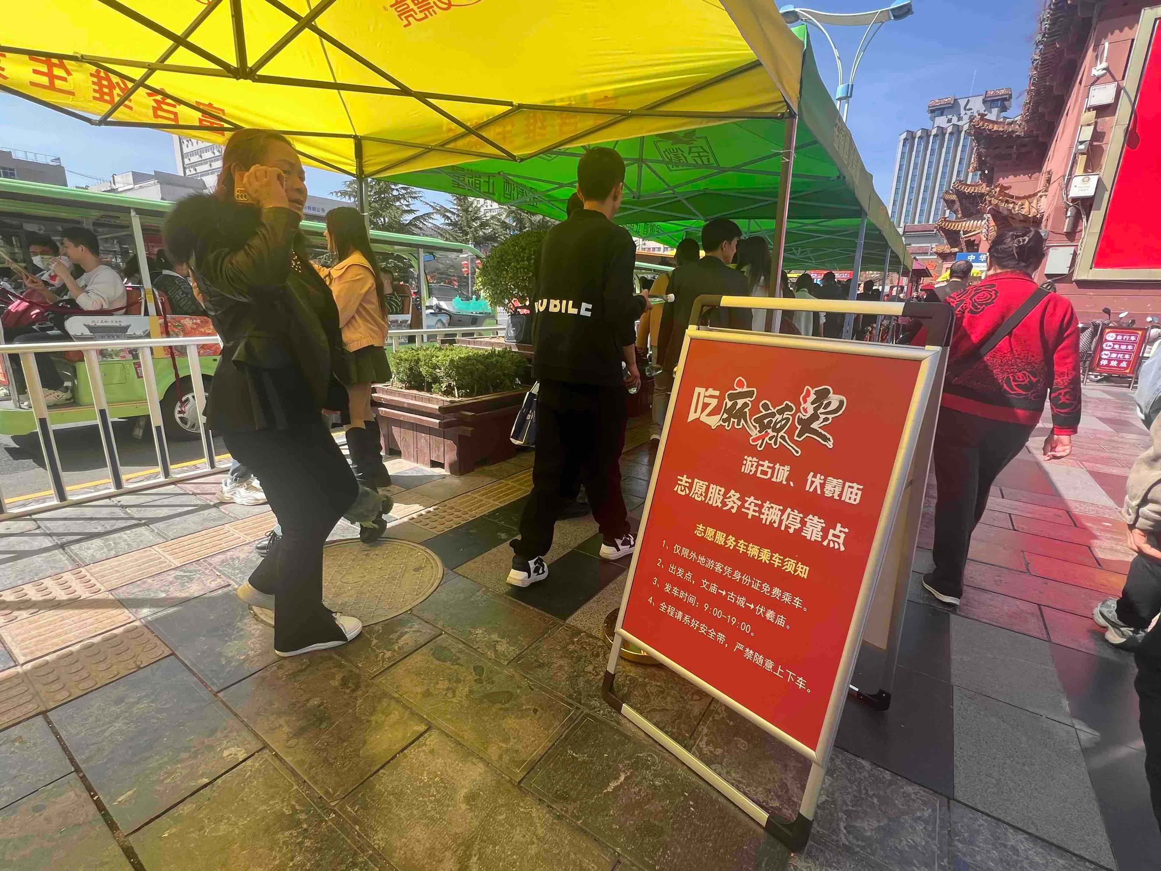 吃完麻辣烫如果还想逛其他地方,怎么办?距离不远处设置有志愿者服务车辆停靠点,外地游客凭借身份证便可免费乘车,行程停靠文庙、古城和伏羲庙。