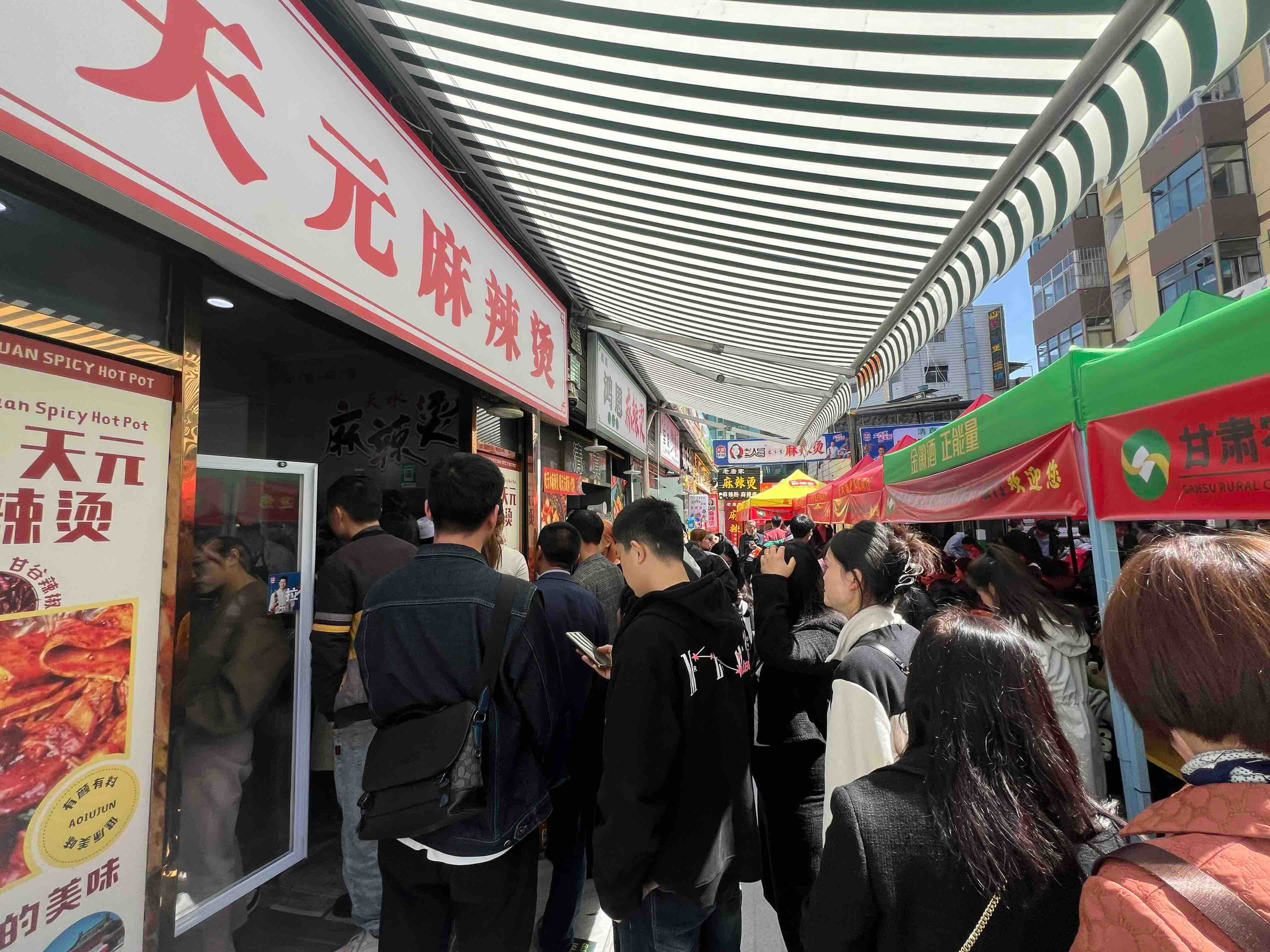 在出站口,便能看到设置有甘肃麻辣烫咨询展位,身着蓝色背心的工作人员热情地向往来游客吆喝,展位的桌子上摆着不同景区的纸质版宣传资料。走出出站口,甘肃麻辣烫的招牌随处可见,多家名优特产品的厂家支起台子,现场售卖自家产品。顺着人潮,便能看到青年志愿者服务岗、麻辣烫公交专线引导岗。