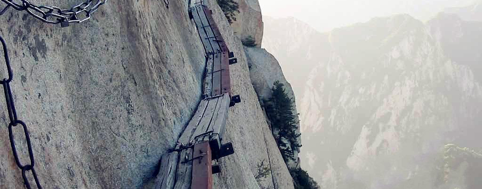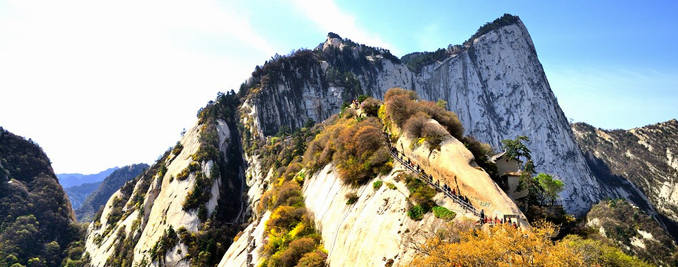 长空栈道位于华山南峰东侧山腰,十分陡峭险峻。