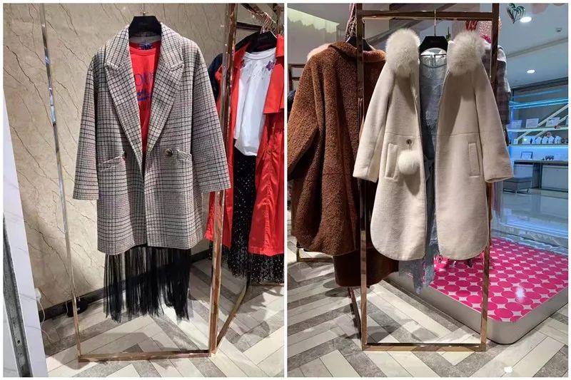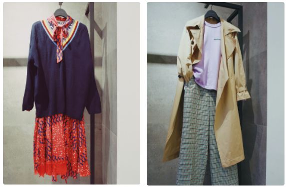 左:蓝色毛衫:原价698元,现价349元;裙子:原价798元,现价399元。右:风衣:原价1580元,现价1106元;紫色卫衣:原价498元,现价349元;裤子:原价698元,现价489元。