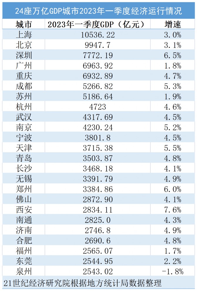 福建的两座万亿GDP城市福州和泉州一季度出现失速,增速在24座万亿GDP城市中排在末尾两位。一季度,福州GDP总量为2565.07亿元,同比增长1.7%;而泉州经济总量为2543.02亿元,同比下跌1.8个百分点,是万亿GDP城市中唯一出现负增长的城市。