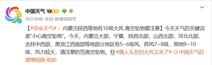 今天天气的关键词是“小心高空坠物”。今天,内蒙古大部、宁夏、陕西北部、山西北部、河北北部、吉林中西部、黑龙江西南部等地部分地区有5~6级风、阵风7~8级,局地9~10级,风力较大,请注意防范高空坠物。