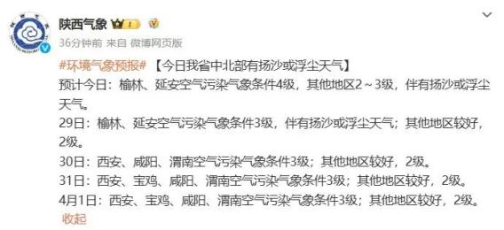 29日:榆林、延安空气污染气象条件3级,伴有扬沙或浮尘天气;其他地区较好,2级。