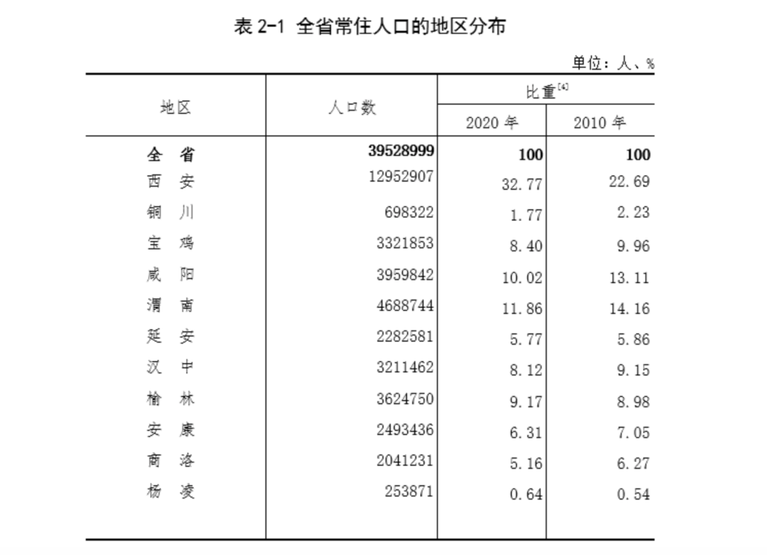 七普陕西人口数据,其中关中地区(指西安、铜川、宝鸡、咸阳、渭南、杨凌6市<区>)人口为25875539人。 陕西省统计局官网 图