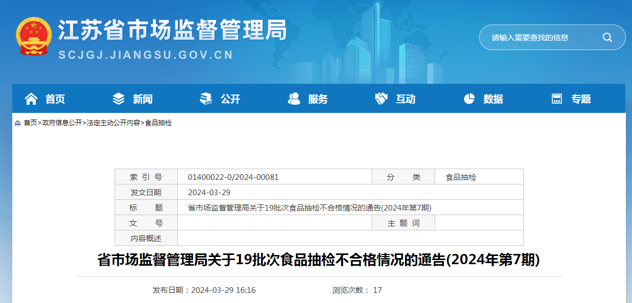 省市场监督管理局关于19批次食品抽检不合格情况的通告(2024年第7期)