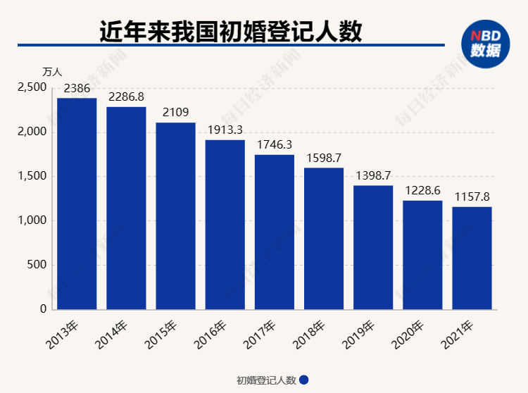 2021年我国初婚登记人数仅相当于2013年的一半左右数据来源:国家统计局
